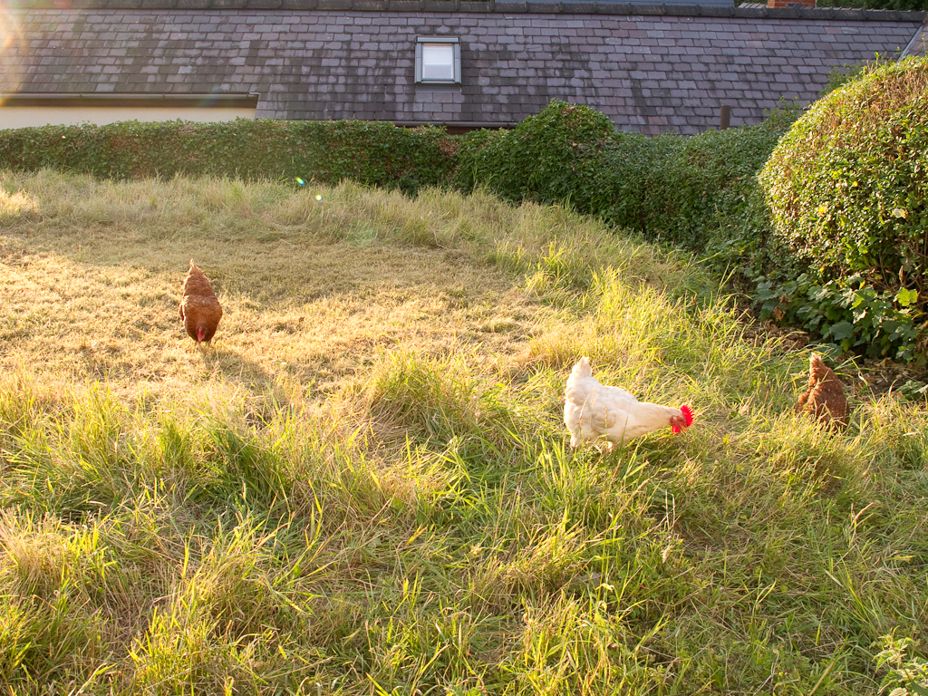 The chickens can’t believe their luck, being bundled in a cardboard box from their muddy home in suburban Chester, to emerge into a sunny wild foraging garden with a view!